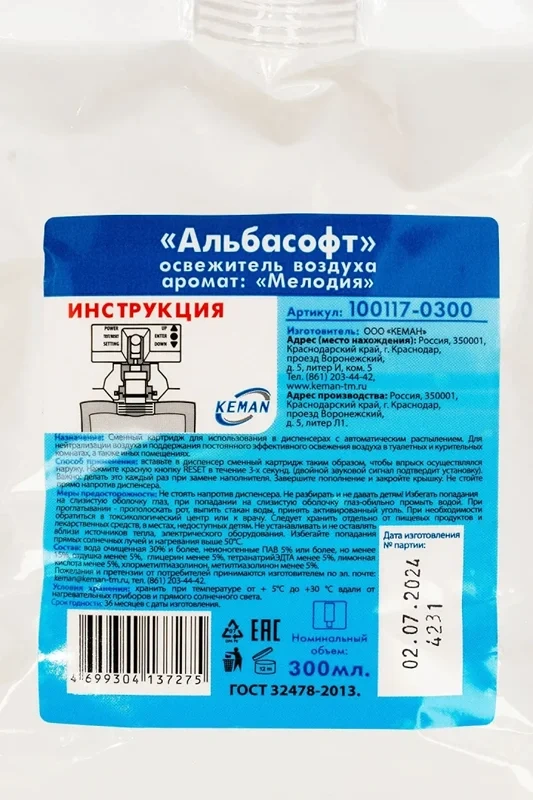 Запасной картридж для освежителя воздуха Keman Аквариус А4 300мл, Мелодия, 100117-0300