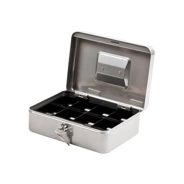 Металлический ящик для хранения и транспортировки наличных денежных средств. Может быть использован в офисе и дома для хранения различных мелких предметов. Цвет - серебристый. Пластиковая полка для мелочи. Ручка для переноски.