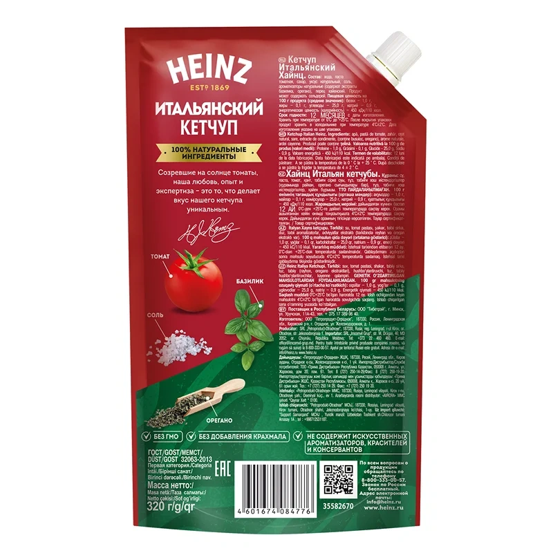 Кетчуп итальянский Heinz дой-пак, 320г — соус, вкус которого напоминает о теплой солнечной Италии. Секрет продукта в особом сочетании пряностей и зелени, соотношение которых взято в соответствии с классическими средиземноморскими рецептами. Такой кетчуп отличается нежным и в меру пикантным вкусом. Представленный кетчуп Heinz идеально дополнит блюда итальянской кухни — пиццу, пасту, лазанью. Он также хорошо сочетается с мясными блюдами, шашлыками и грилем, картофелем, овощами, бургерами и хот-догами. Его можно использовать в качестве компонента для заправок, соусов и подлив, которые наполнят блюда пряным южным ароматом. Кетчуп Итальянский Heinz представлен в удобном дой-паке. Такая упаковка позволяет точно отмерять необходимое количество соуса, а также использовать все до последней капли. Герметичная закручивающаяся крышка нужна для того, чтобы сохранить насыщенность вкуса и аромата продукта. После вскрытия упаковки продукт необходимо хранить в холодильнике.