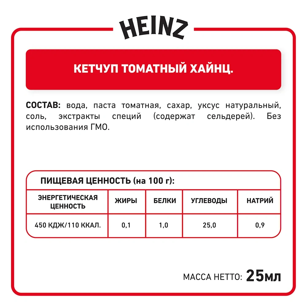Кетчуп Heinz томатный (25мл x 125шт), 3.125кг не содержит искусственных ароматизаторов, красителей, консервантов, без добавления крахмала. Секрет уникального вкуса кетчупа – в использовании специально выращенных сортов томатов с повышенным содержанием пектина и ликопина. Одноразовую упаковку дип-пот удобно хранить, транспортировать, использовать и утилизировать.