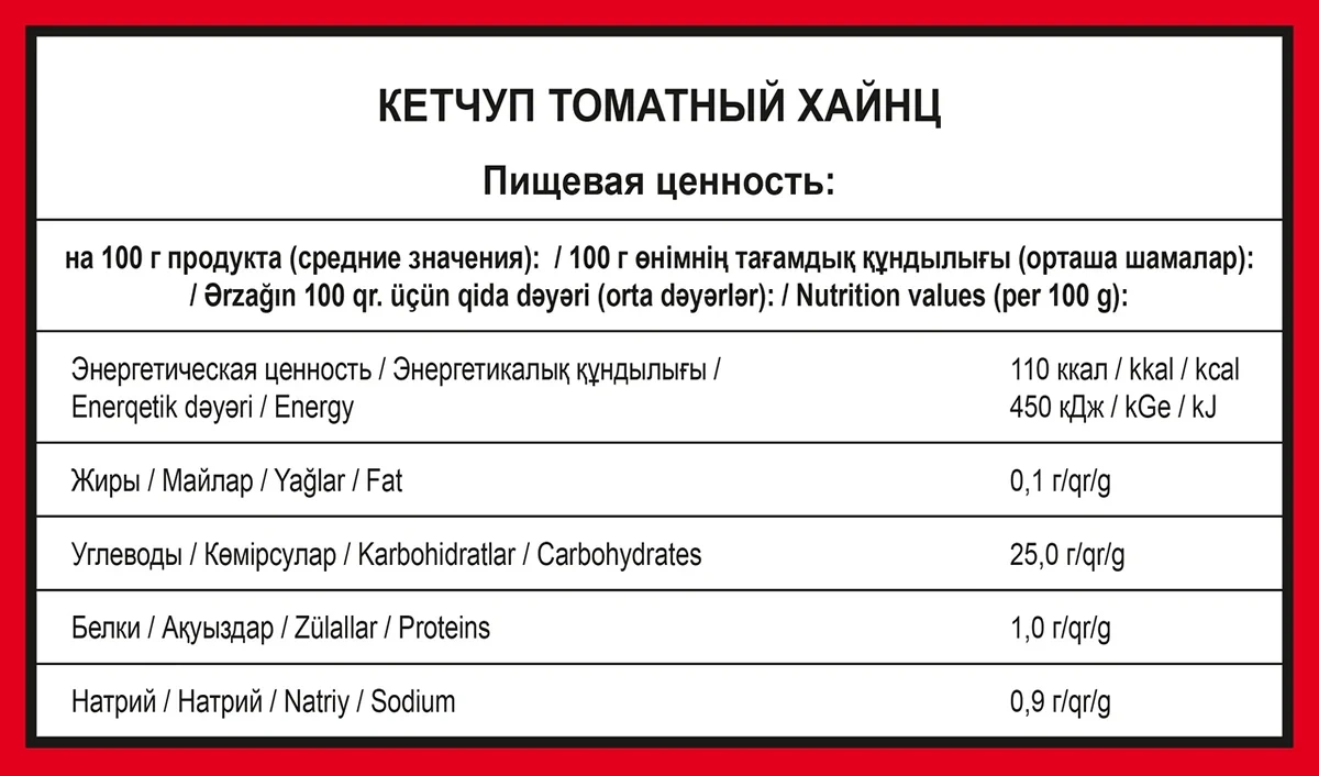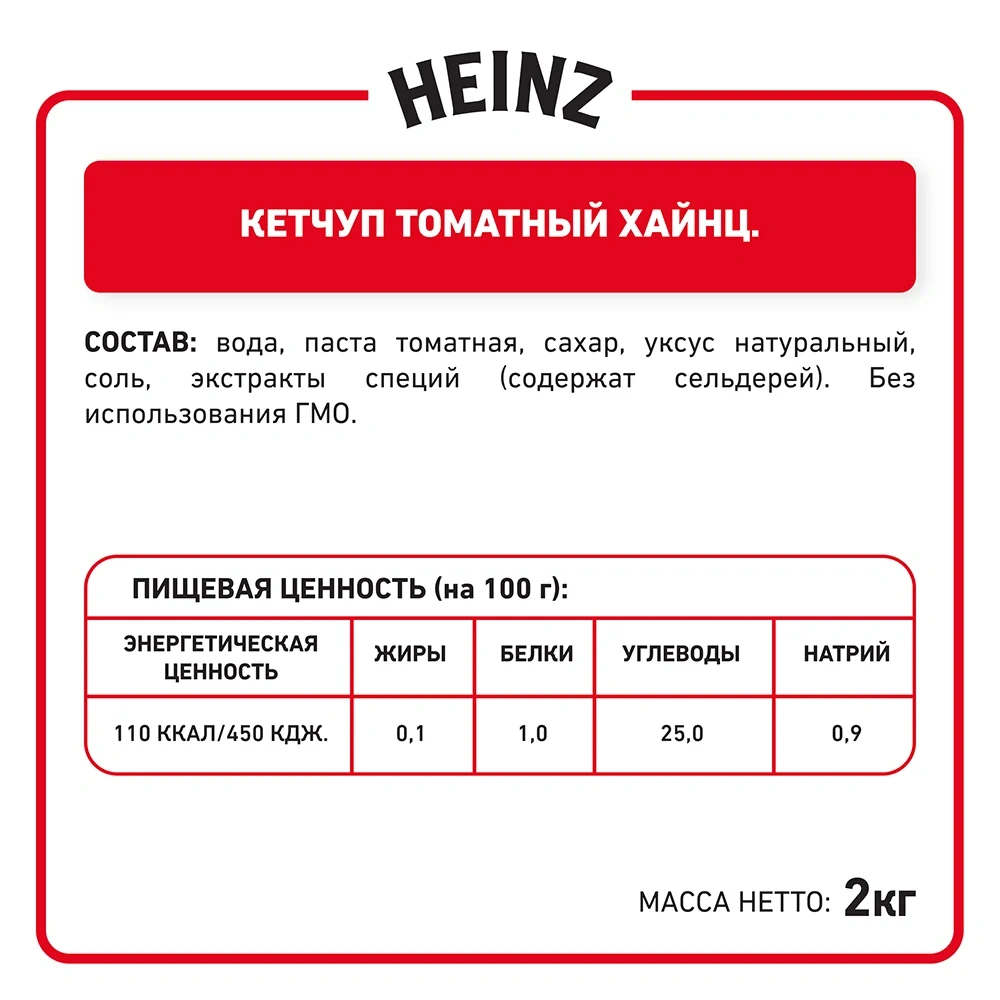 Томатный кетчуп Хайнц — 100% натуральные ингредиенты. Он не содержит искусственных ароматизаторов, красителей, консервантов, без добавления крахмала. Секрет уникального вкуса кетчупа Хайнц — в использовании специально выращенных сортов томатов с повышенным содержанием пектина и ликопина.