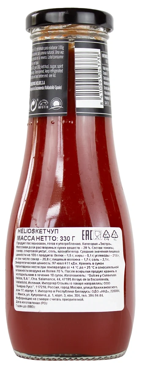 Кетчуп от бренда Helios создан из натуральных ингредиентов - лучших помидоров из испанских садов Андалусии. Имеет аромат сочных спелых помидоров и обладает классическим вкусом, прекрасно дополняя блюдо.