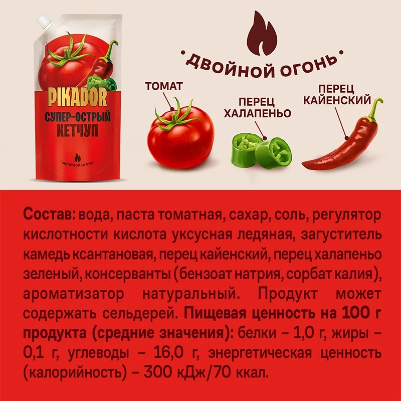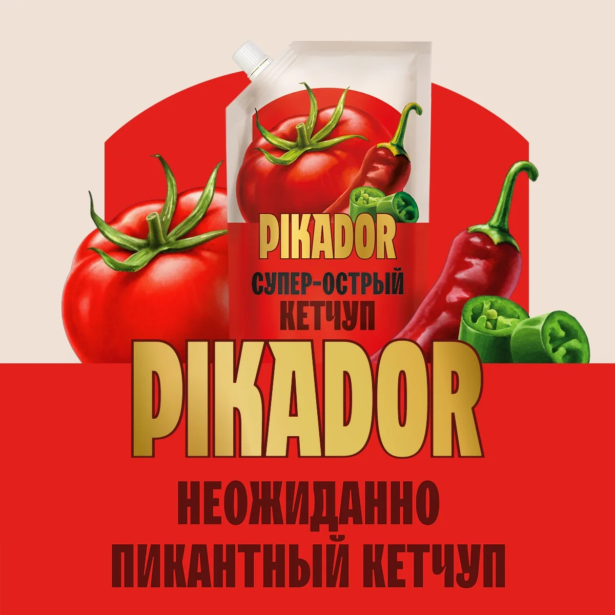 Супер-острый томатный кетчуп Pikador создан специально для тех, кто хочет добавить в жизнь острые ощущения. Это неожиданно пикантный кетчуп, который говорит сам за себя. Двойной огонь кайенского перца и зеленого перца халапеньо придаст яркости и жгучей остроты любому блюду. Оригинальными и пикантными станут простые котлеты или сосиски, а картофель фри, спагетти и куриные крылышки приобретут просто термоядерные нотки. Этот острый кетчуп будет уместен на пикнике к жареным на гриле колбаскам и шашлыку.