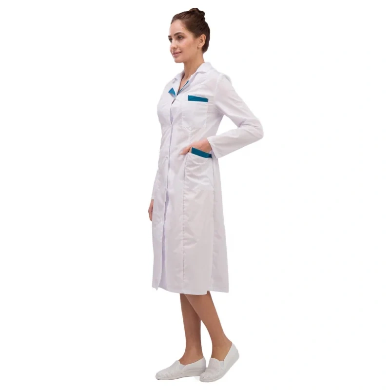 Предназначен для работников лабораторий, медицинских учреждений, пищевой и фармацевтической промышленности. Халат из легкой прочной ткани. Легко стирается.