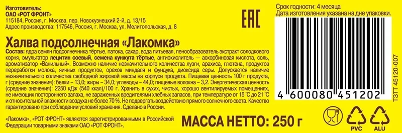 Халва Рот Фронт Лакомка подсолнечная, 250г