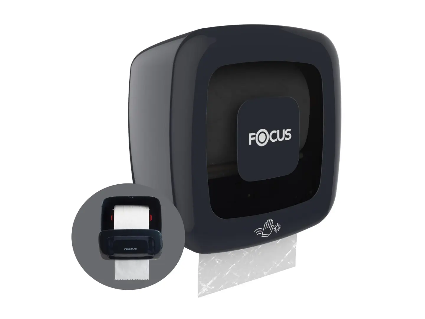 Диспенсер Focus (Фокус) с автоматическим отрывом. Изготовлен из качественного, глянцевого пластика черного цвета. Подача осуществляется снизу, по центру. Подходит для полотенец шириной 22 см и диаметром рулона 23 см.Диспенсер Focus для рулонных полотенец с автоматическим отрывом. Цвет - угольныйРазмер диспенсера: 36 х 23,94 х 37,32 смПодходят расходники: 5043330, 5050095, 5046577, 5050023