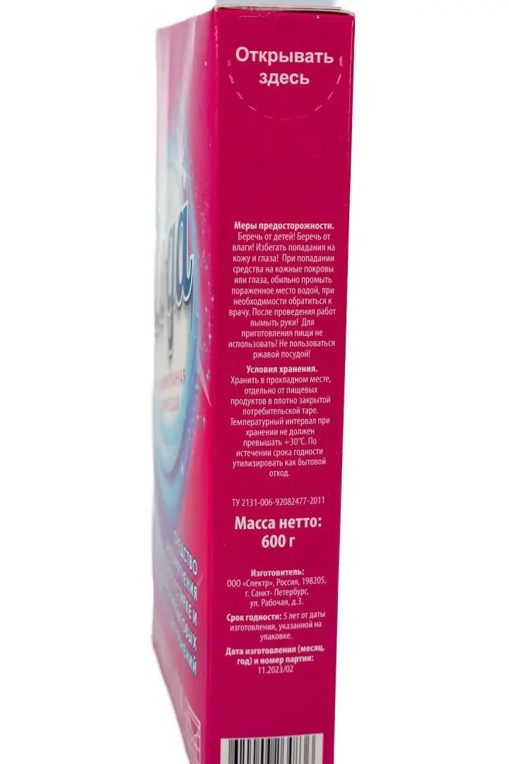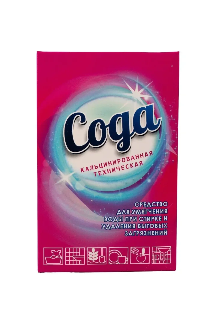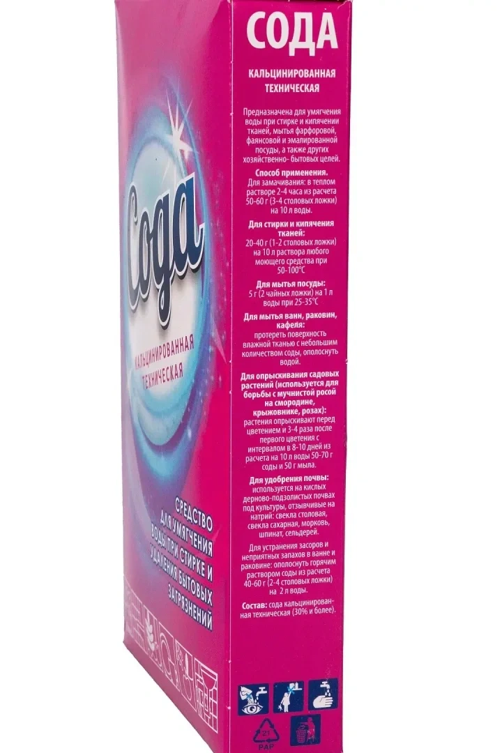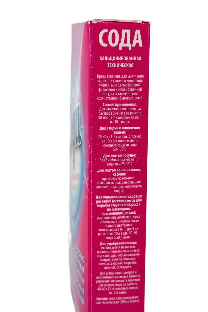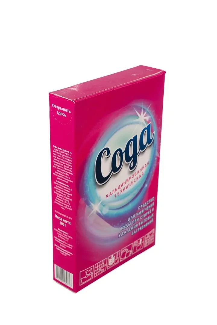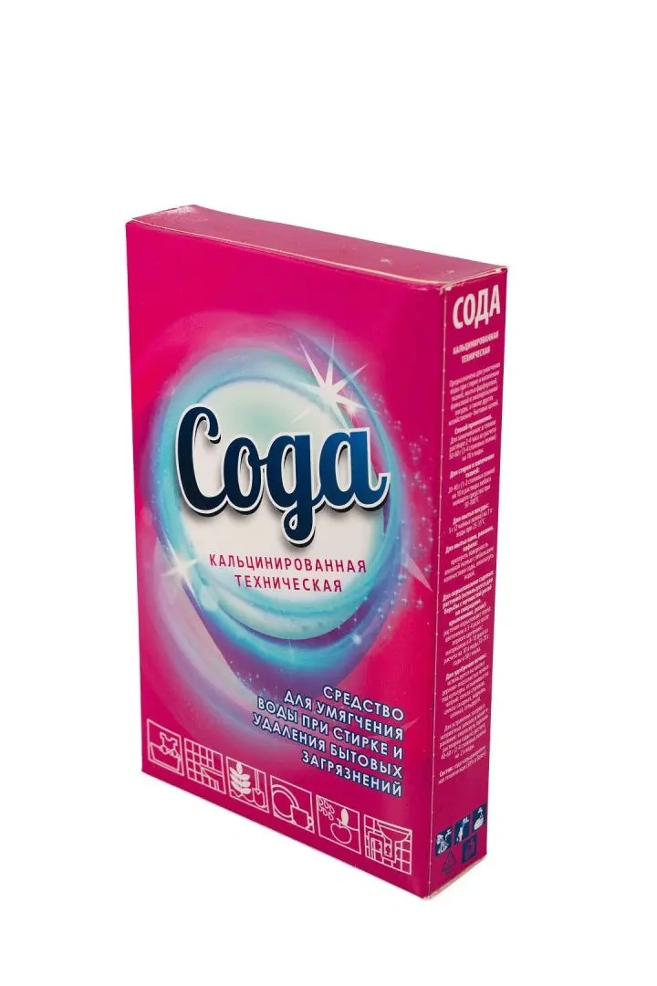 Сода 600г кальцинированная, картонная пачкаСода кальцинированная (натрий углекислый) применяется для мытья фарфоровой, фаянсовой, эмалированной, керамической посуды, чистки кафеля, раковин, ванн, линолеума, стирки и кипячения, замачивания хлопчатобумажных, льняных тканей, смягчения воды и пр.