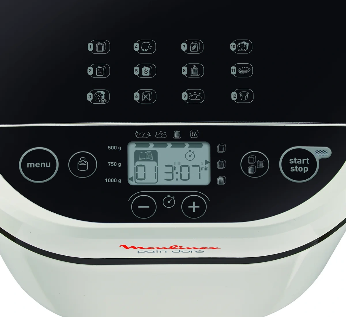 Хлебопечь Moulinex OW 210 представляет собой функциональное и практичное устройство для выпекания булочек, бисквитов, хлеба. Оно запрограммировано на 12 различных режимов. Модель отличается простотой в эксплуатации благодаря понятному меню, сенсорному интерфейсу управления. Она работает при мощности 650 Вт, поэтому без усилий за несколько минут выпекает свежий домашний хлеб. Универсальный таймер устанавливает определенный диапазон времени. Готовить хлебобулочные изделия, тесто для пиццы, пирожных, джемов можно, не находясь дома. Кроме того, с помощью прибора легко сделать варенье и каши. Его камера вмещает от 0,5 до 1 кг хлеба. До момента выбора определенной программы можно назначить цветовой уровень зажарки: румяная или золотистая корочка, легкая или сильная степень прожарки. Модель оснащается полезной функцией отложенного старта до 15 часов, а также системой автоподогрева до 60 минут. За хлебопечкой легко ухаживать благодаря съемному контейнеру с антипригарным покрытием. Он подходит для мытья в посудомоечной машине.