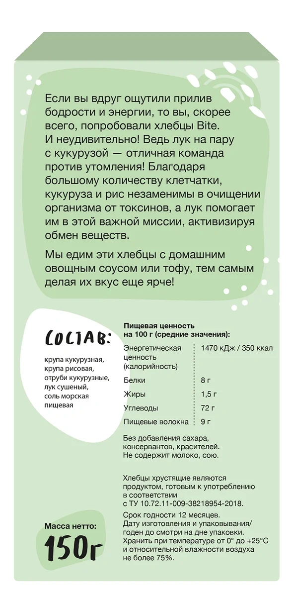 Кукурузно-рисовые хлебцы Bite с луком — полезная альтернатива хлебу без глютена, сахара и дрожжей. Они сытные, вкусные и полезные одновременно, ведь в составе только натуральные ингредиенты. Благодаря большому количеству клетчатки, кукуруза и рис незаменимы в очищении организма от токсинов, а лук активизирует обмен веществ и укрепляет иммунитет. Добавьте авокадо, веганский сыр или любой соус: от хумуса до гуакамоле — и вы получите вкусный, сытный и низкокалорийный перекус без вреда для фигуры!