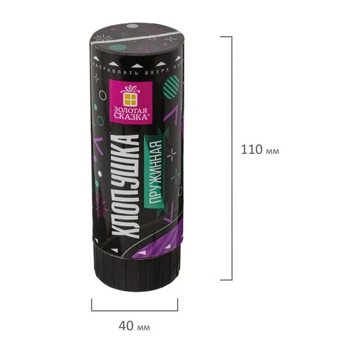 Хлопушка высотой 11 см с фольгированным наполнителем в виде серпантина и конфетти цвета ассорти является абсолютно безопасной, так как действует на основе пружинного механизма. Не является пиротехникой. Средняя дальность выстрела хлопушки с данным типом наполнения – 2 м. Хлопушка может быть использована как внутри помещений, так и на улице.
