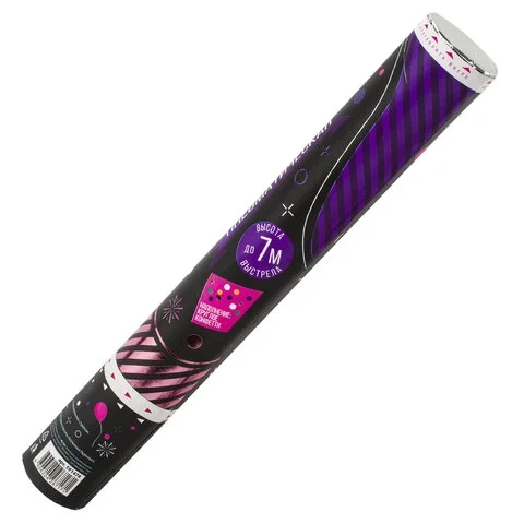 Хлопушка высотой 30 см с фольгированным круглым наполнителем цвета ассорти является абсолютно безопасной. Выстрел осуществляется под действием сжатого воздуха. Не является пиротехникой. Средняя дальность выстрела – 5-7 м. Корпус хлопушки состоит из двух частей: пневматического баллона со сжатым воздухом и картонного цилиндра с наполнителем. Рекомендуется использовать хлопушку внутри больших помещений или на улице.
