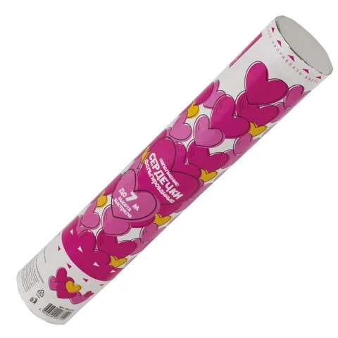 Хлопушка высотой 20 см с фольгированным наполнителем в виде сердечек красного цвета является абсолютно безопасной. Выстрел осуществляется под действием сжатого воздуха. Не является пиротехникой. Средняя дальность выстрела – 5-7 м. Корпус хлопушки состоит из двух частей: пневматического баллона со сжатым воздухом и картонного цилиндра с наполнителем. Рекомендуется использовать хлопушку внутри больших помещений или на улице.