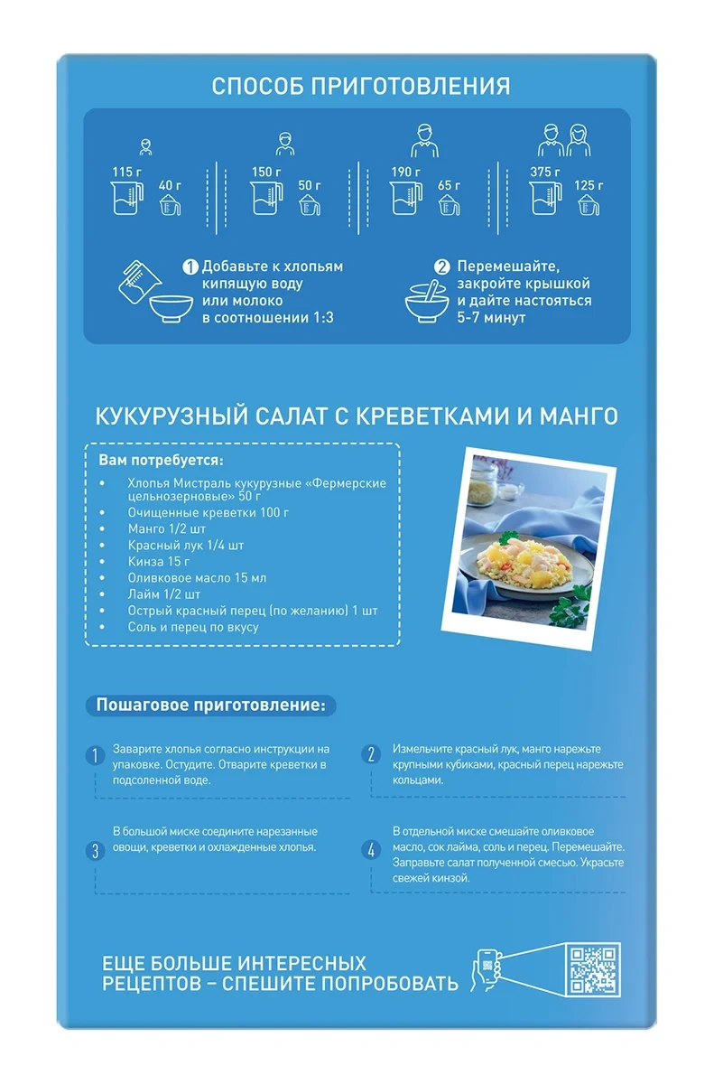Идеальное решение для быстрого, вкусного и полезного завтрака для всей семьи. В состав входят исключительно цельные кукурузные зерна, выращенные на экологически чистых полях России без применения вредных химических удобрений. Кукуруза – древнейшее злаковое растение, которое в настоящее время по продаваемости уступает только пшенице. Ее яркие желтые зерна богаты витаминами группы В, калием, фосфором, магнием и клетчаткой. Порция кукурузной каши, съеденная ранним утром, обеспечит вам заряд энергии и отличное настроение на весь день, улучшит пищеварение, подарит длительное чувство насыщения, поможет укрепить иммунитет.