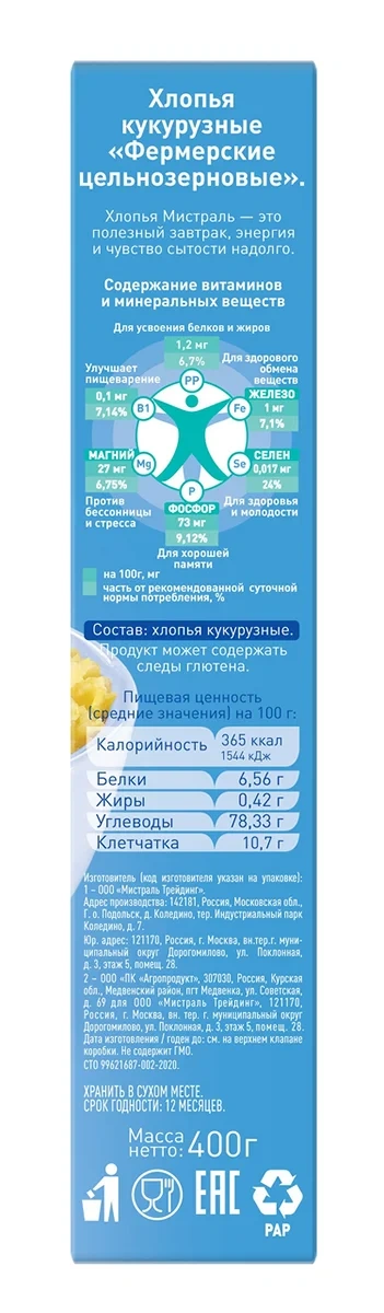 Хлопья кукурузные Мистраль фермерские, 400г