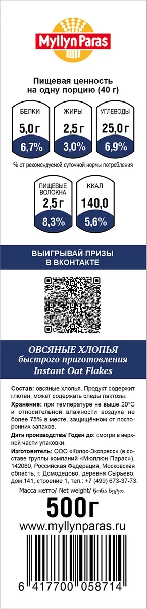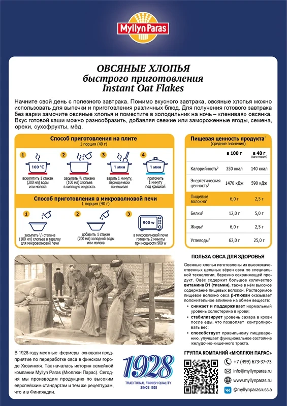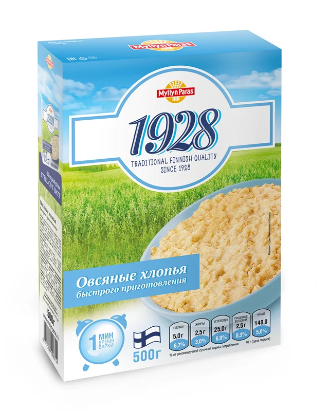 Хлопья овсяные 1928 Myllyn Paras, 500г – это отличный способ очистить ЖКТ, избавиться от шлаков в организме и укрепить иммунитет. Они являются прекрасным абсорбентом, который улучшает самочувствия и способствует снижению уровня холестерина в крови. Благодаря высокому содержанию клетчатки улучшается моторика кишечника и нормализуется пищеварение. Пищевые волокна (основная составляющая отрубей) уменьшают риск появления канцерогенов и способствуют распаду жиров. Хлопья не содержат красителей, ароматизаторов и консервантов – это абсолютно чистый продукт, который идеально подходит для приготовления каш. Их употребление на завтрак дает заряд бодрости и сил на весь день.