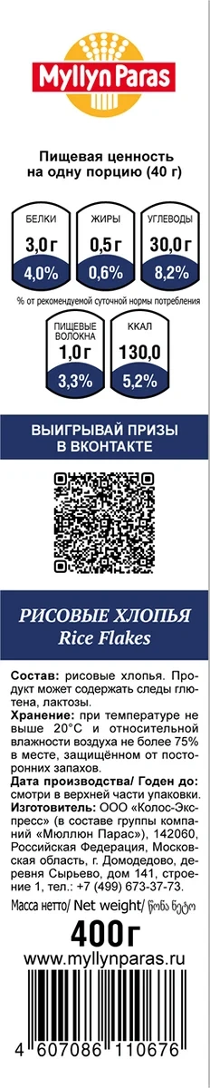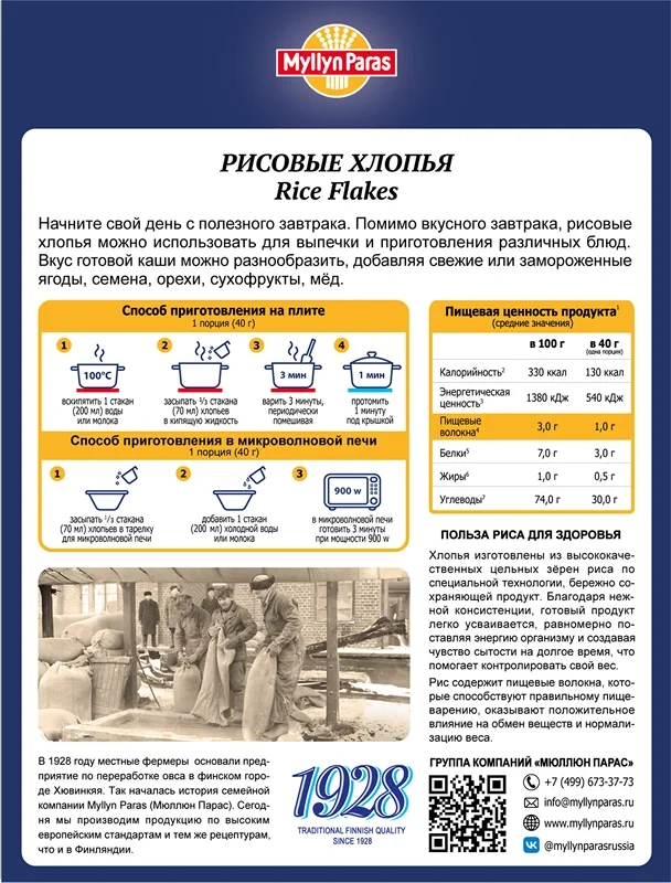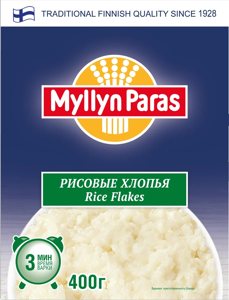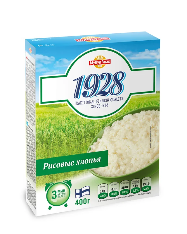 Хлопья рисовые 1928 Myllyn Paras, 400г производятся из качественных зерен риса. Зерна проходят предварительную очистку, расплющиваются в хлопья, не смешиваются с добавками и консервирующими веществами. Из хлопьев можно готовить вкусные и полезные каши, где сохранены витаминные компоненты, минералы, пищевые волокна. Также хлопья риса можно использовать для выпекания печенья, пирогов, хлеба, других сдобных изделий. Еще хлопья можно использовать в качестве диетической добавки, употребляя их совместно с кисломолочной продукцией, киселем. Отличный вкус, полезность для организма и невысокая стоимость – ключевые достоинства продукта.