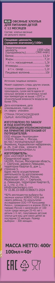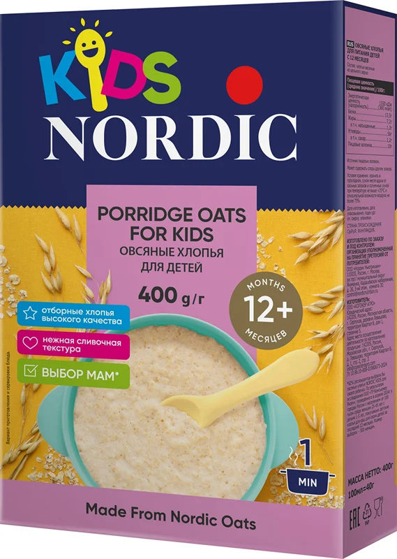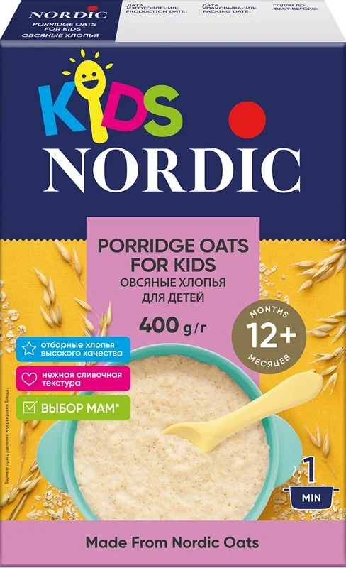 Овсяные хлопья из цельного, специально разработанные для питания детей с 12 месяцев. Калиброванное финское зерно бережно очищают от шелухи, пропаривают под давлением, режут и плющат до толщины 0,35мм. Благодаря такой технологии обработки хлопья сохраняют всю природную пользу зерна, а каша имеет нежную консистенцию и сливочный вкус, которую любят дети и ценят их мамы. Согласно исследованиям, проведенным компанией-производителем, мамы очень высоко оценили вкус и качество нового продукта. Более 82% мам готовы выбрать данный продукт для своего ребенка и доверяют бренду Nordic, так как каждая мама выбирает для своего ребенка самое лучшее и полезное. А Nordic качество и вкус своих продуктов сохраняет на высоком уровне вот уже 30 лет. Специально разработаны для питания детей с 12 месяцев. Произведены из калиброванной финской овсянки. Имеют нежную сливочную структуру 100% цельное зерно. цельнозерновые хлопья пропарены, порезаны и раскатаны до толщины 0,35мм, поэтому каша из них получается особенно нежной, с выразительным сливочным вкусом. Благодаря бережной обработке овсяное зерно сохраняет все полезные свойства.