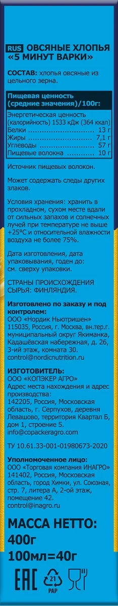Хлопья овсяные Nordic 5 минут варки, 400г