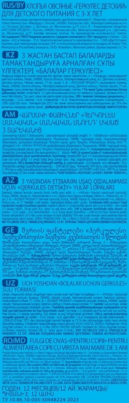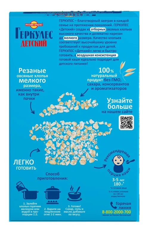 Продукт изготовлен из отборных овсяных хлопьев высокого качества и деликатно нарезан до мелкого размера. Качество хлопьев соответствует высочайшему уровню требований к продуктам для детей. Это овсяные хлопья мелкого размера, из которых получаются особенно нежные и воздушные каши. Геркулес содержит большое количество витаминов и минералов - это вкусный и питательный завтрак. Заряд энергии и бодрости на весь день.