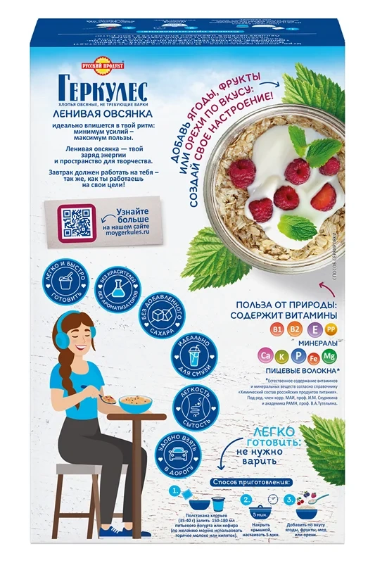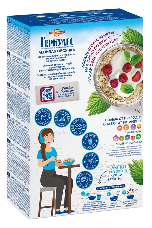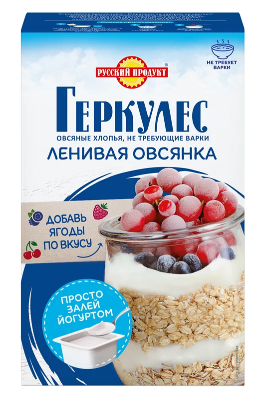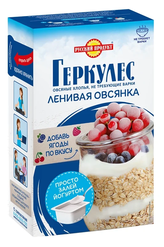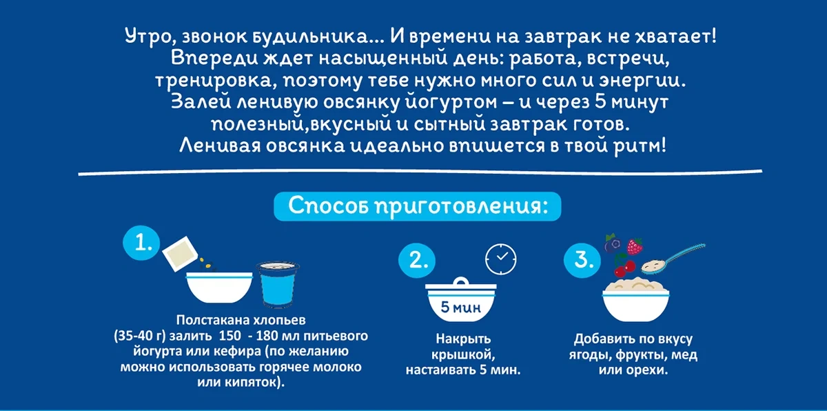 Утро, звонок будильника: И времени на завтрак не хватает! Впереди ждет насыщенный день: работа, встречи, тренировка, поэтому тебе нужно много сил и энергии. Залей ленивую овсянку йогуртом - и через 5 минут полезный, вкусный и сытный завтрак готов. Изготовлен из отборных овсяных хлопьев высокого качества и деликатно нарезан до мелкого размера. Качество хлопьев соответствует высочайшему уровню требований к продуктам для детей. Хлопья легко и быстро готовить.