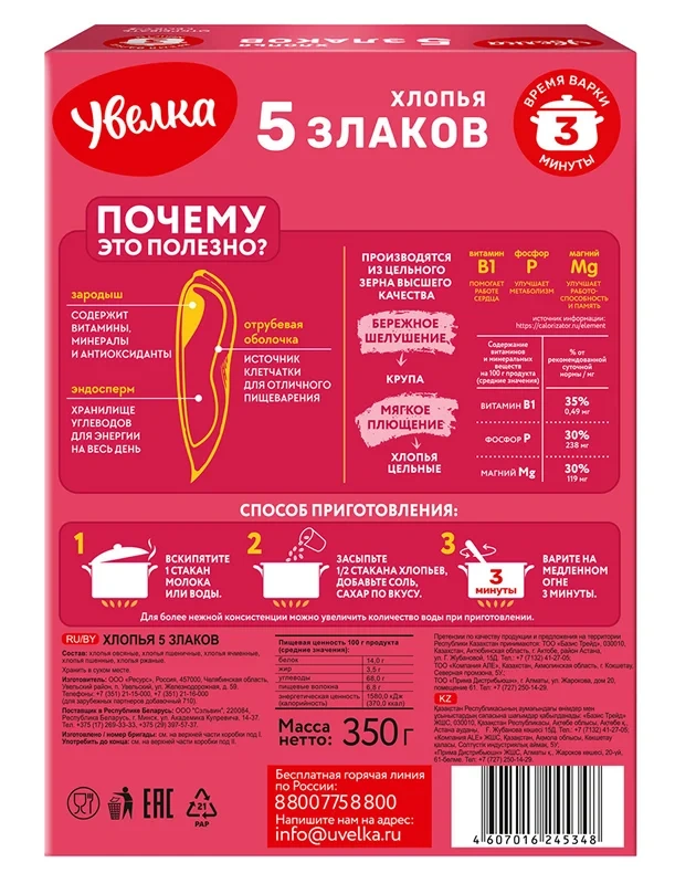 Приготовлены из цельных зерен овса, пшеницы, ячменя, пшена и ржи, прошедших двухэтапную очистку от примесей, лузги и битых ядер. Чистые отборные зерна подвергаются бережной обработке путем резания и сплющивания, в результате которых получается 100% натуральный продукт, сохранивший всю пользу цельных злаков.