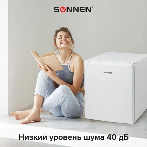 Средняя температура морозильной камеры составляет -3°С. Компактный и стильный холодильник SONNEN DF-1-06 потребляет незначительное количество энергии 0,38кВ/сут и подходит под класс энергоэффективности 'А'.