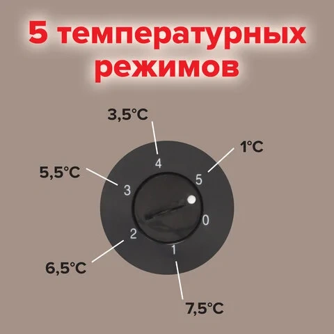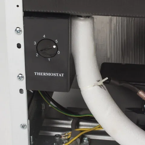 На задней части корпуса установлен термостат, с помощью которого можно настроить мощность охлаждения. Термостат включается в себя 5 температурных режимов: