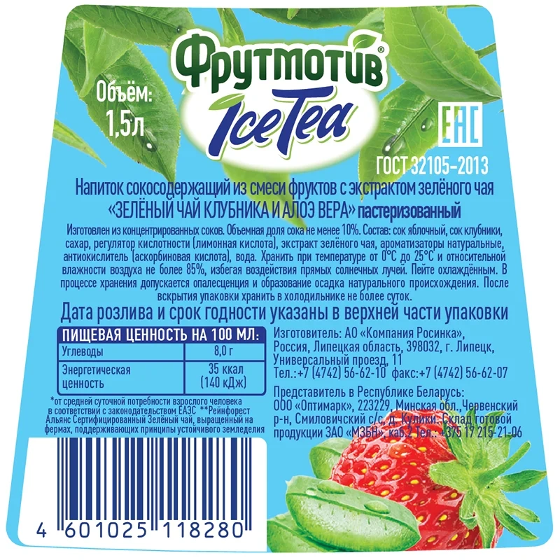 Чай зеленый Фрутмотив холодный клубника-алоэ, 1.5л x 6 шт - попробуй яркое сочетание клубники и алое вера в бодрящем зеленом чае. Один глоток подарит вам ощущение теплого солнечного дня. За его тонкими нотками следует изысканное послевкусие. Напиток с сохранением свойств растительных ингредиентов, натуральных экстрактов и ароматизаторов. Напиток прекрасно вписывается в образ жизни современного человека: он содержит питьевую воду, натуральные фруктовые соки, ароматизаторы и минимум сахара. Насыщенный яркий вкус зеленого чая с ягодными акцентами. Рекомендуется пить охлажденным.