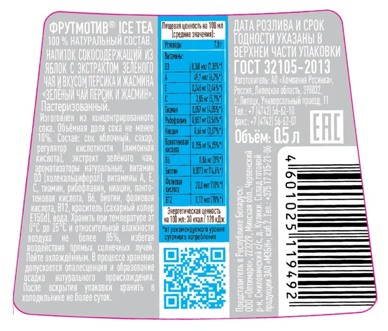 Вода, сахар, регуляторы кислотности (лимонная кислота, цитрат натрия 3-замещенный), экстракт черного чая, малиновый сок (из концентрата), ароматизатор, антиокислитель аскорбиновая кислота, подсластитель натуральный экстракт стевии.