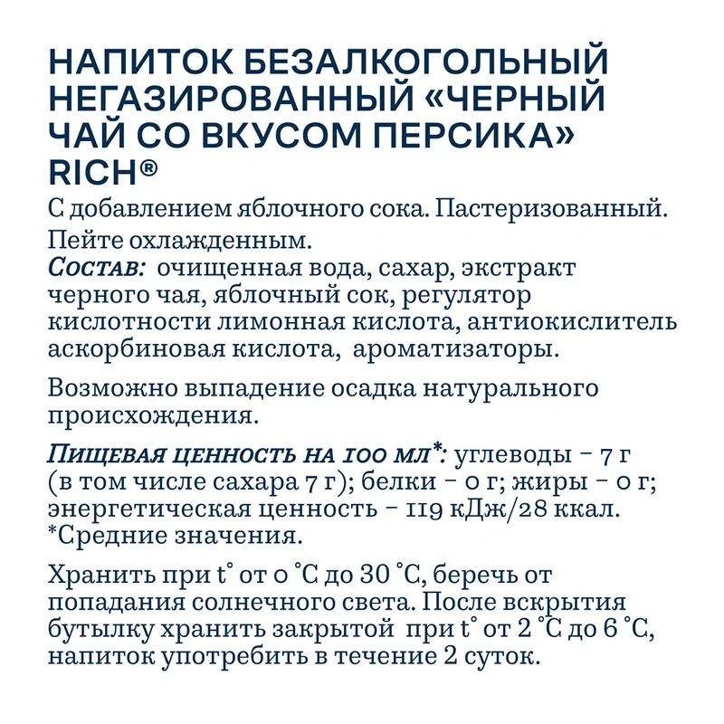 Чай Rich Tea холодный черный персик, 1л, поданный в охлажденном виде, отлично утоляет жажду, заряжает положительными эмоциями и дарит отличное настроение. Напиток хорошо сочетается с горячими блюдами, закусками. Он отличается приятным вкусом. Благодаря оптимальному содержанию полезных веществ чай можно включать в повседневный рацион. Напиток поставляется в герметичной бутылке с плотно завинчивающейся крышкой. Это позволяет сохранить все полезные и вкусовые качества чая. Хранить продукт следует вдали от прямых солнечных лучей и источников тепла, а после вскрытия упаковки — в холодильнике в течение двух суток. На этикетке с фирменным логотипом производитель указал всю необходимую покупателю информацию — о составе, дате изготовления, рекомендуемом температурном режиме. Благодаря компактным размерам бутылочку удобно взять с собой на прогулку, учебу, тренировку или в путешествие. Rich — это эталон качества, стиля и статуса. Это продукт, продиктованный временем. Он предназначен для независимых, активных людей, нацеленных на успех и стремящихся получать удовольствие от жизни. Rich — это наслаждение великолепным вкусом свежих фруктов — с одной стороны. Современный взгляд на мир — с другой. Умение находить во всех проявлениях жизни ее светлые стороны — с третьей. И ощущение гармонии — с четвертой.