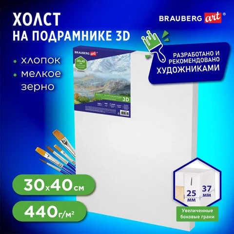 Холст 3D на подрамнике BRAUBERG ART CLASSIC 30х40см, 440г/м, грунт, 100% хлопок мелкое зерно, 191663