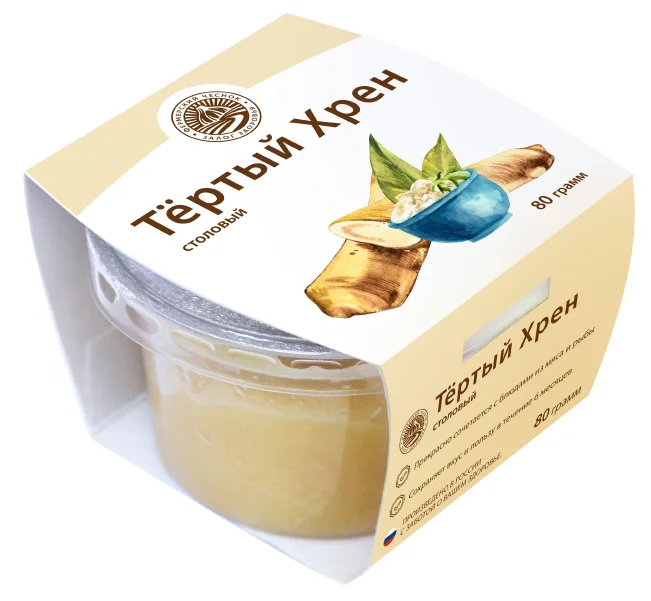 Хрен обладает традиционным светло-бежевым цветом и однородной густой консистенцией, которая хорошо распределяется и удерживается на поверхности продуктов.