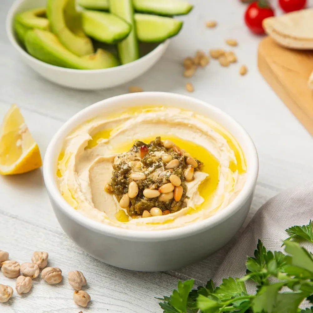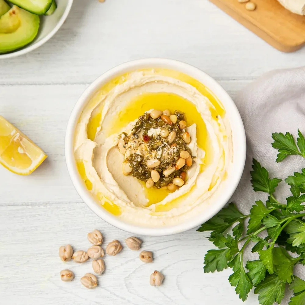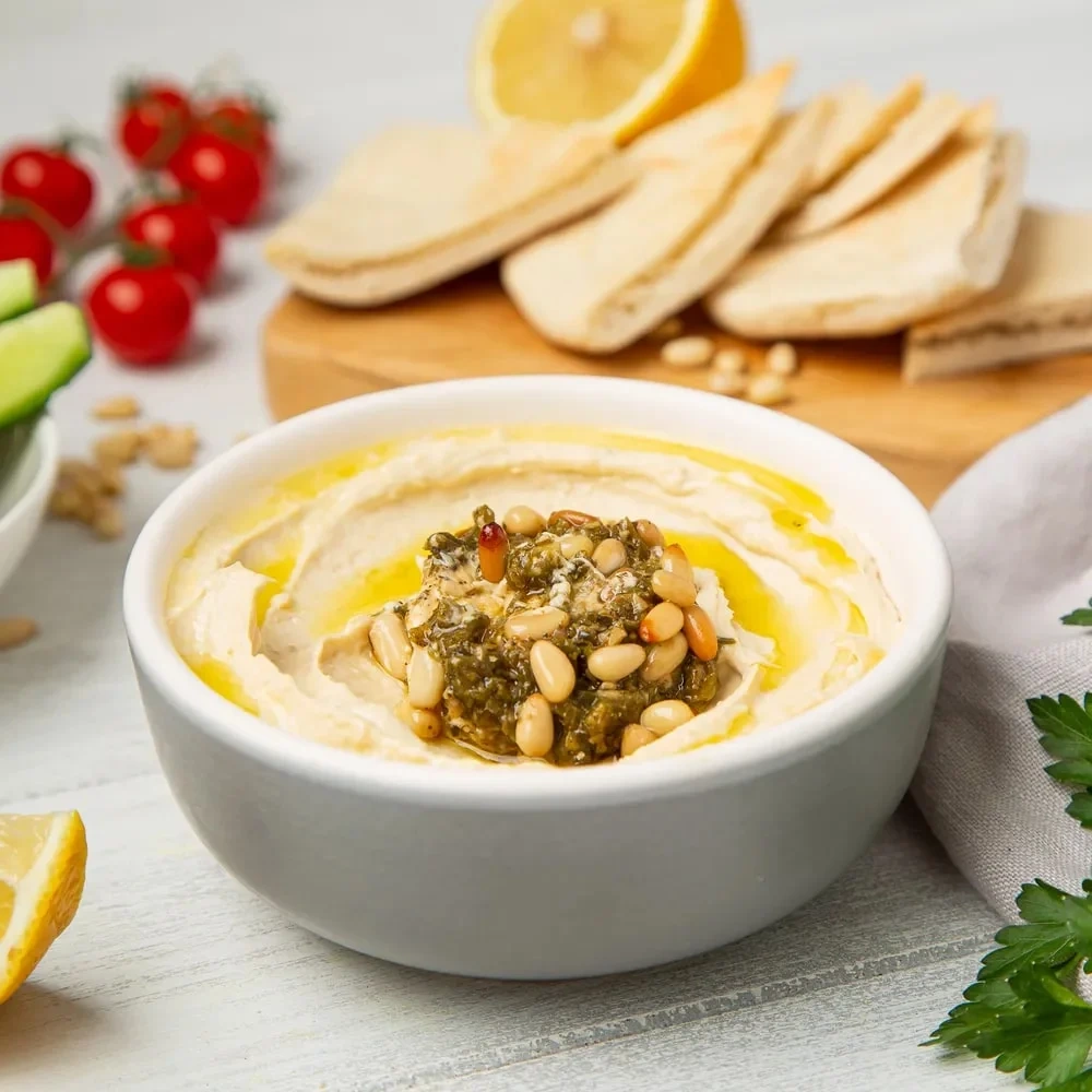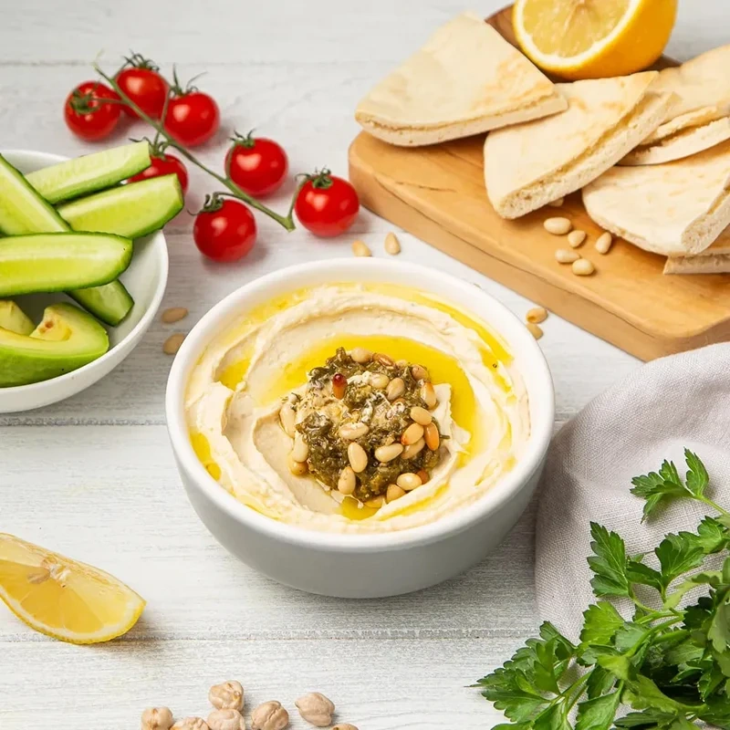 Закуска, созданная на основе нута с пастой из кунжутных семечек, оливковым и растительным маслом, солью. Она имеет нежную кремовую текстуру. Для ее приготовления используется традиционный рецепт. Продукт служит источником растительной клетчатки, ненасыщенных жиров и белка. Это блюдо относится к постному столу и подходит для утреннего или вечернего перекуса. Представленный продукт достаточно сытный и быстро утоляет голод.