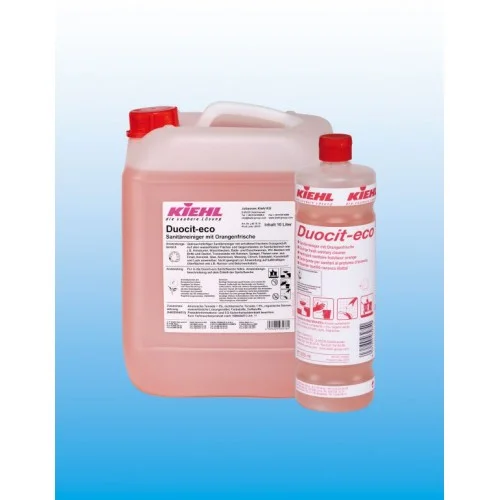 Средство для чистки санитарных помещений со свежим стойким апельсиновым запахом. Быстро и гигиенично удаляет остатки косметики, кальциевые и мыльные отложения. Регулярное применение Duocit-eco предотвращает дальнейшее образование на предметах и поверхностях кальциевых отложений и улучшает их внешний вид. Состав продукта Duocit-eco направлен на сохранение качества окружающей среды и разрешает присвоение ему «Экологического знака Соответствия» Европейского Союза.