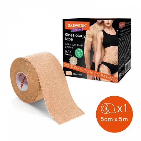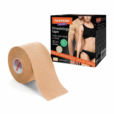 Кинезио тейп/лента для лица и тела, омоложение и восстановление, 5 см х 5 м, бежевый, DASWERK, 68000