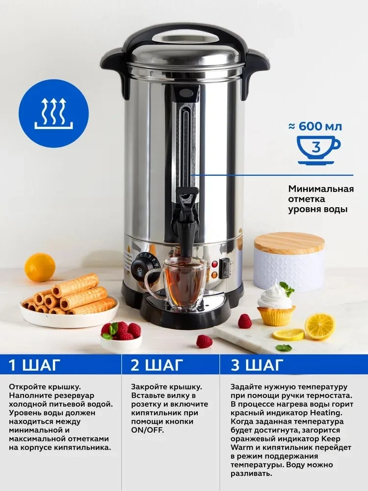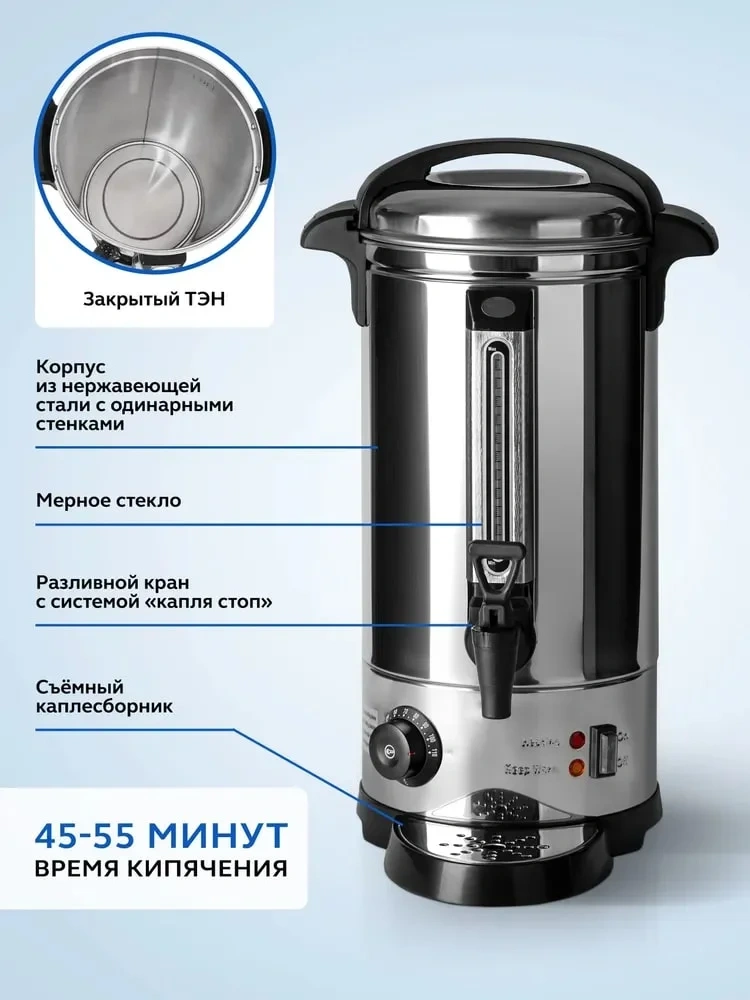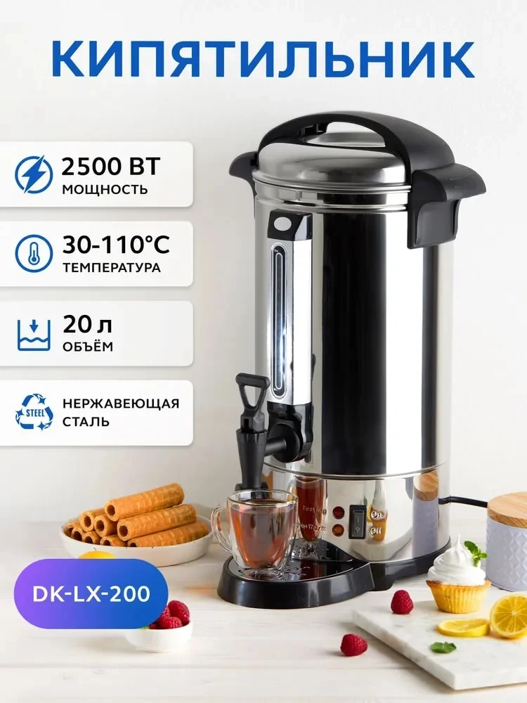 Кипятильник Gastrorag DK-LX-200 используется на предприятиях общественного питания и торговли, в офисах, отелях и т.д. для нагрева большого количества воды. Модель оснащена терморегулятором, одинарными стенками, закрытым ТЭНом, сливным краном и каплесборником. Корпус выполнен из нержавеющей стали и пластмассы.