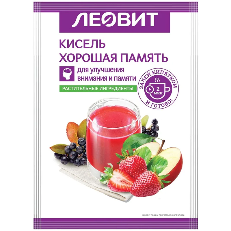Лечебный и профилактический Кисель «Хорошая память» рекомендован для улучшения памяти, когнитивных способностей, концентрации внимания. По данным доклинических и клинических исследований продукт улучшает обменные процессы в тканях головного мозга, снижает утомляемость, повышает умственную работоспособность. Состав: сахароза, крахмал картофельный, фрукты и ягоды (яблоки, рябина черноплодная, клубника), мука овсяная, витамины (С, ниацин), минеральное вещество – цинк, экстракт радиолы розовой, молочко маточное пчелиное, пыльца цветочная, имбирь, биологически активное вещество – янтарная кислота, свекла, пищевые волокна (гуаровая камедь), регулятор кислотности – лимонная кислота, ароматизатор. На предприятии перерабатываются: арахис, кунжут, орехи, сельдерей, соя, молоко. Пищевая ценность (средние значения) в 100 г сухого продукта/в одной порции (20 г)/% ССП*: углеводы, г – 93/19/5, витамин С, мг – 500/100/167, ниацин, мг – 46,6/9,3/51,7, цинк, мг – 30/6/40, энергетическая ценность, кДж (ккал) – 1600 (380)/320 (75)/3. Средняя суточная потребность. Назначение: в качестве специализированного пищевого продукта диетического профилактического питания при состояниях утомления, сопровождающихся расстройством внимания и памяти, с высоким содержанием витамина С, витамина РР, цинка. Рекомендации по приготовлению: высыпать содержимое пакета в кружку, залить 200 мл кипящей воды, перемешать, дать настояться 2 минуты. Ограничения по использованию: индивидуальная непереносимость компонентов. Условия хранения: в сухом месте при нерегулируемой температуре. Срок годности: 2 года. Дата изготовления: см. на упаковке.