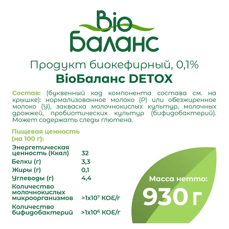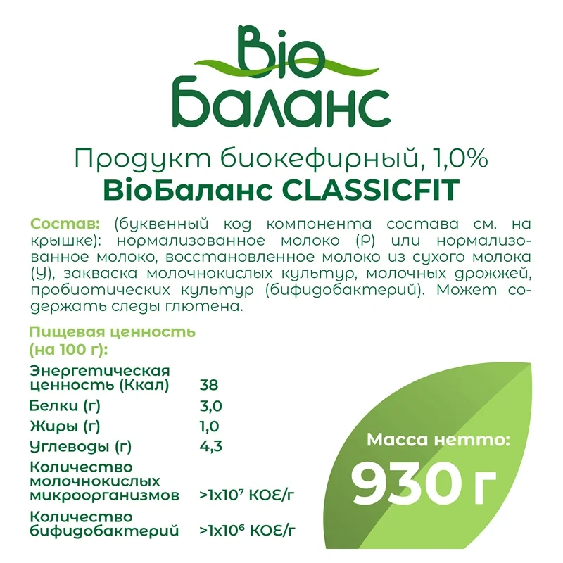 Кефирный продукт Bio Баланс натуральный 0.1%, 930г