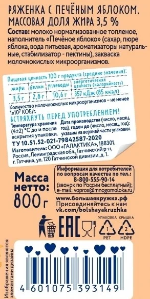 А - молоко нормализованное, сахар, вода, глюкозно-фруктозный сироп, концентрированный яблочный сок, ароматизатор, концентрированный мультифруктовый сок, стабилизатор - пектин, концентрированный клубничный сок, витаминно-минеральный премикс, краситель - бета-каротин, регуляторы кислотности (лимонная кислота, цитрат натрия 3-замещенный), закваска, пробиотические микроорганизмы (Lactobacillus Casei, Lactobacillus Rhamnosus);
