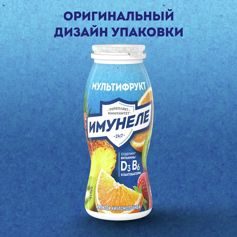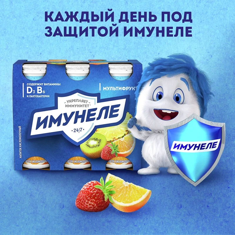 Напиток кисломолочный Имунеле Мультифрукт 1.2% 100г. Йогурт питьевой Имунеле содержит уникальный сбалансированный комплекс полезных лактобактерий, витаминов и минералов. Пробиотик L.Casei нормализует микрофлору кишечника и защищает ее от микробов. L.Rhamnosus дополняет его действие, укрепляя иммунитет. Витамины E и D3 помогают организму сопротивляться инфекциям и препятствуют старению иммунной системы. Цинк противостоит простудам, а йод придает сил. Институт питания РАМН рекомендует Имунеле для ежедневного применения, особенно в холодное время года.