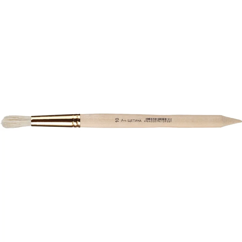 Кисть для рисования круглой формы предназначена для работы с масляными красками и тушью. Пучок изготовлен из натуральной щетины, которая отличается высокой жёсткостью и упругостью. Волос хорошо удерживает краску, обеспечивает плотное и равномерное нанесение, а также позволяет создавать выразительные мазки и фактурные элементы.