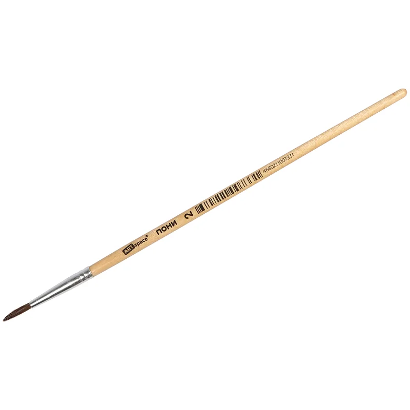 Художественные кисти ArtSpace изготовлены из волоса пони. Он несколько толще, чем у белки, расстояние между волосками больше, поэтому воду такая кисточка набирает меньше, чем из белки или колонка. Приобретают форму конуса, не слишком упруги. Кисть круглой формы с короткой ручкой из дерева идеальна для начинающих художников, поэтому её часто используют в детских образовательных учреждениях.