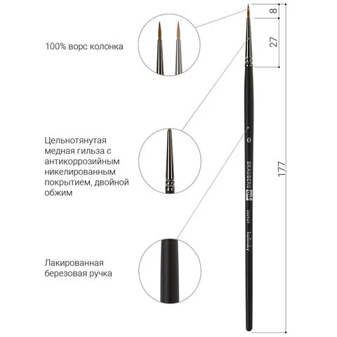 Кисти из колонка отлично впитывают и отдают краску, хорошо держат форму, долговечны и надежны. Кисть № 0 позволит комфортно прорисовывать мелкие детали. Короткая ручка покрыта лаком, что защищает ее от воздействия красок и влаги. Форма пучка - круглая. Упаковка - ОПП-пакет с европодвесом и картонной подложкой.