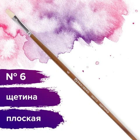 Кисть художественная профессиональная BRAUBERG ART 'CLASSIC', щетина, плоская, № 6, длинная ручка, 2