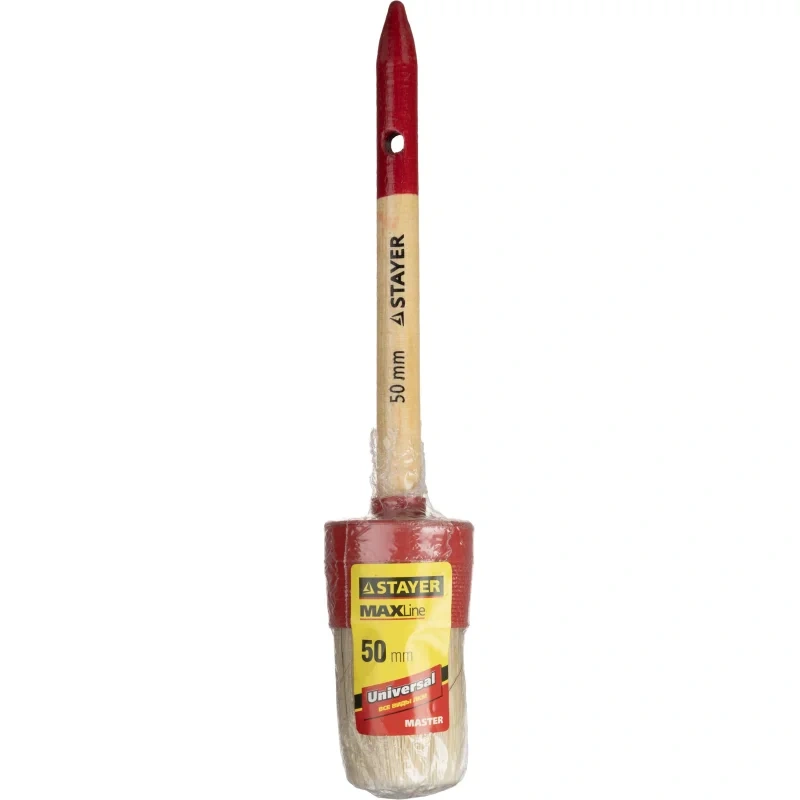 Кисть рекомендована к использованию для медленно сохнущих грунтов, красок без растворителей. Не рекомендуется использовать с клеящими и известковыми веществами, так как волоски держатся на клеевой основе. Пучок, зафиксированный эпоксидной смолой, совместим со всеми типами ЛКМ. Срок службы изделия увеличен за счет пластмассового бандажа. Ворс кисти из натуральной щетины, расщепленной на концах. Ширина кисти: 50 мм, длина: 260 мм. Длина щетины: 50 мм. Рукоять сделана из дерева, обойма — из металла.