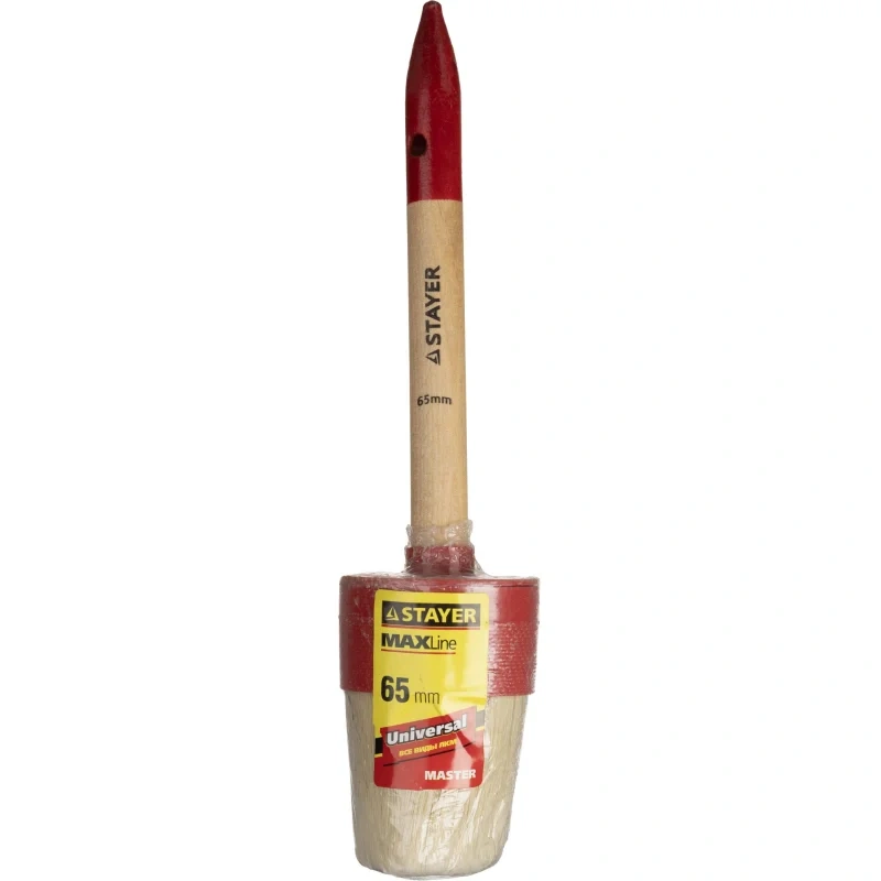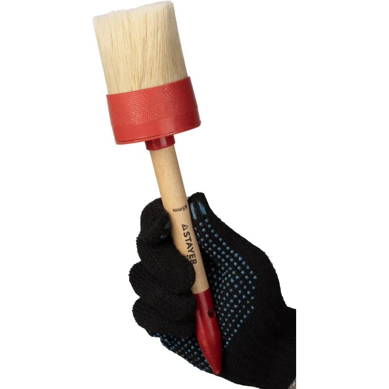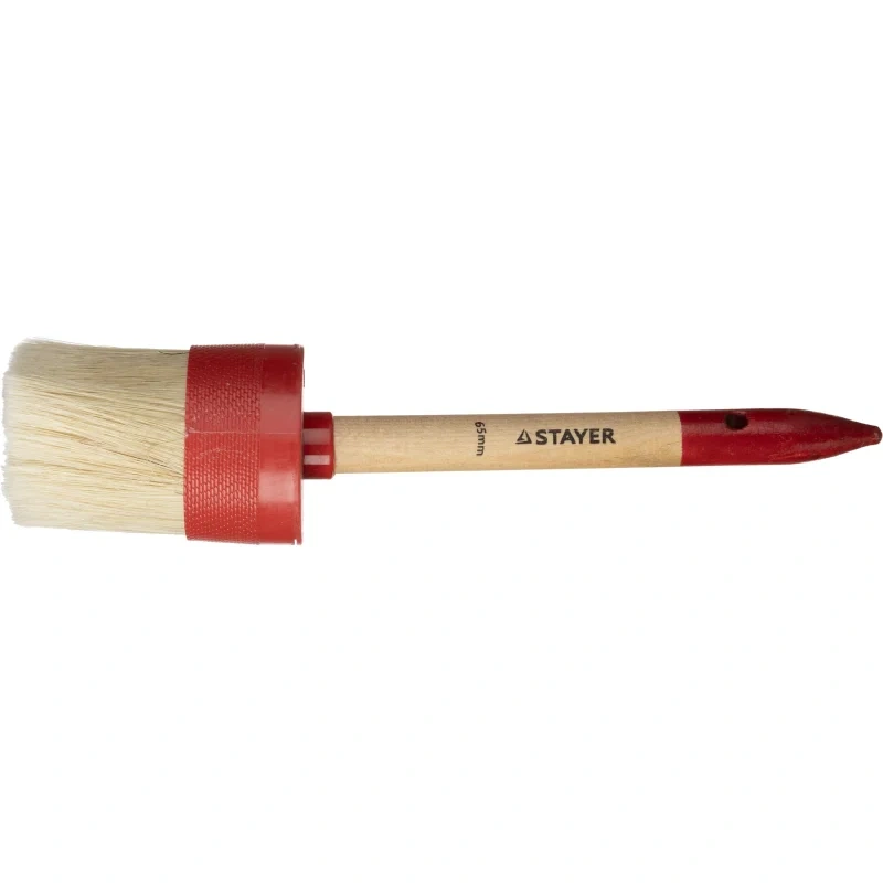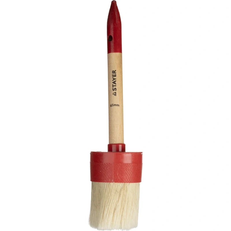 Кругая малярная кисть Stayer 0141-65 предназначена для работы со всеми видами лакокрасочных материалов. В первую очередь — с масляными красками и эмалями. Кисть можно использовать для медленно сохнущих грунтов и красок без растворителей. Не рекомендуется работать с клеящими и известковыми веществами, поскольку волоски держатся на клеевой основе. Пучок, зафиксированный эпоксидной смолой, совместим со всеми типами ЛКМ. Инструмент сделан из светлой натуральной щетины. Деревянная ручка имеет отверстие для подвески. Ширина изделия составляет 65 мм. Обойма изготовлена из пластика, рукоять — из дерева.