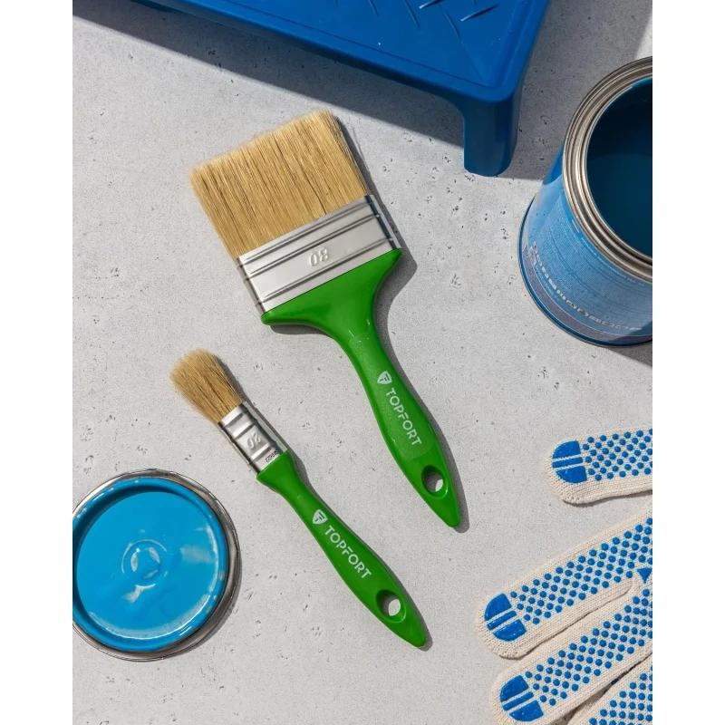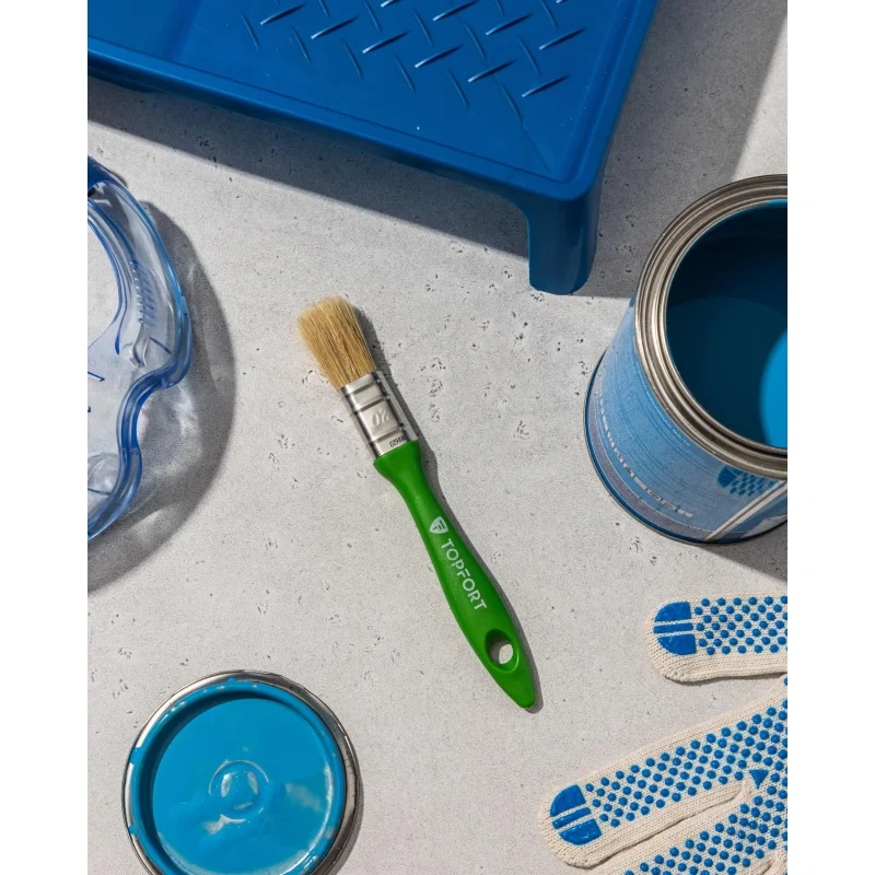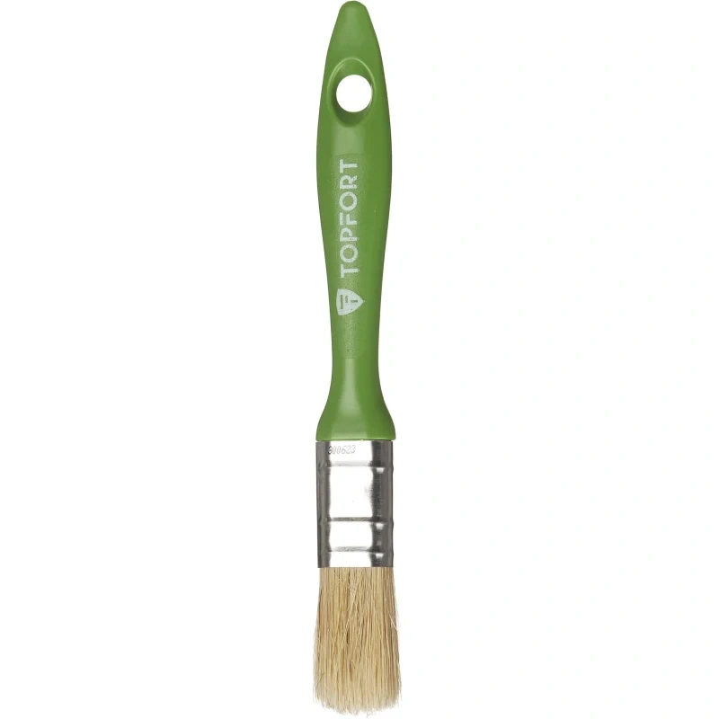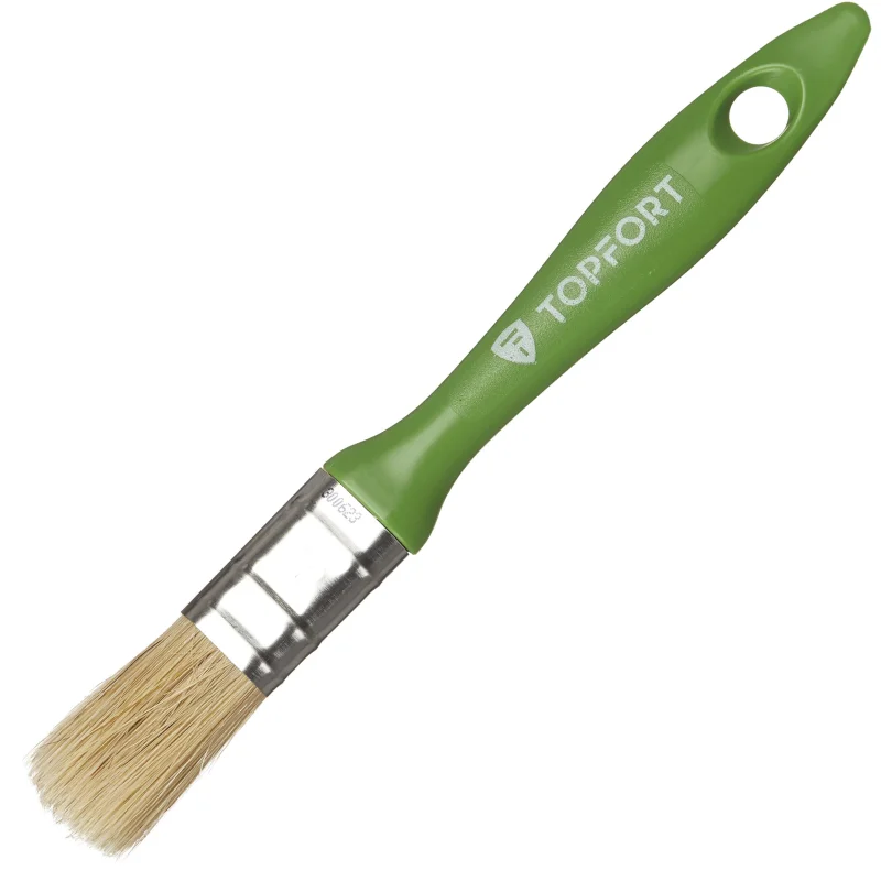 Кисть плоская Topfort предназначена для внешних и внутренних работ. Ее можно использовать для окрашивания поверхностей алкидными красками. Смешанная щетина смешанная средней жесткости надежно закреплена в металлической обойме. Она состоит на 30% из натуральных и на 70% из синтетических волокон с высокой степенью имитации (HIB). Высококачественная щетина (ТОПС 60%) обработана специальным составом, который делает щетину достаточно эластичной. Это обспечивает легкое нанесение краски на поверхность тонким слоем. Ширина изделия составляет 20 мм, толщина ворса: 15 мм. Длина кисти: 180 мм. Обойма кисти изготовлена из металла, рукоять — из пластика. Внешний вид и/или характеристики товара могут быть изменены производителем в соответствии с производственным процессом.