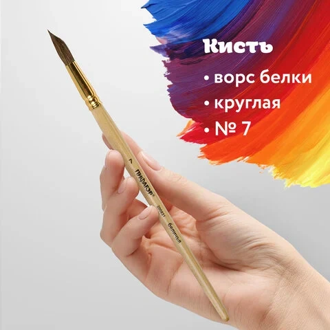 Кисть из волоса белки отлично впитывает и отдает краску, хорошо держит форму, долговечна и надежна. Кисть № 7 позволит прорисовывать детали. Деревянную лакированную рукоятку кисти удобно держать в руке.