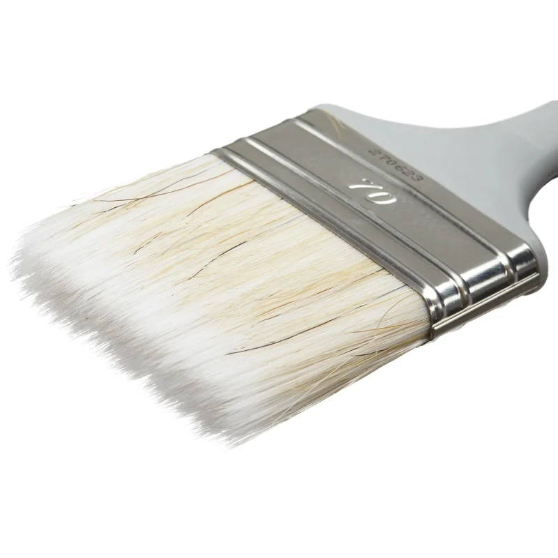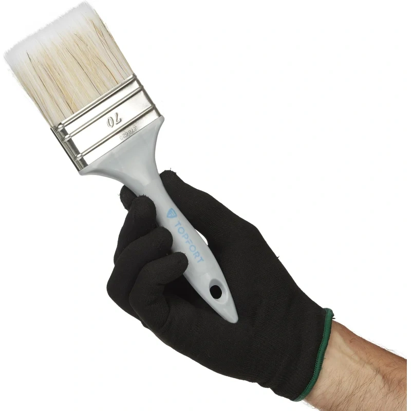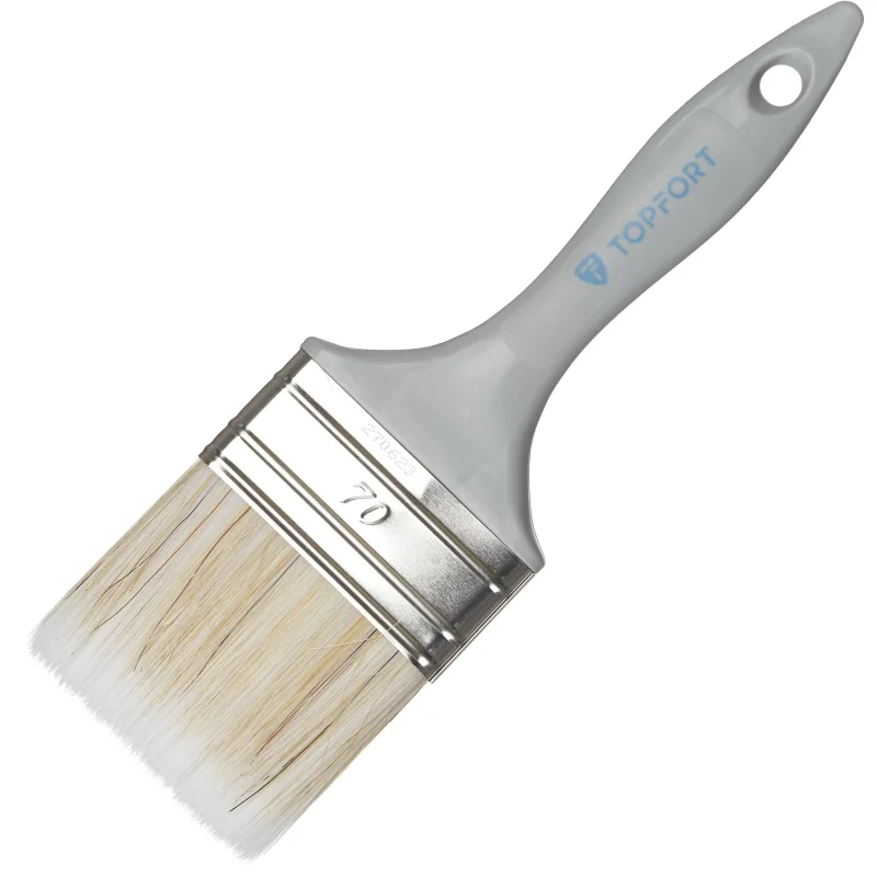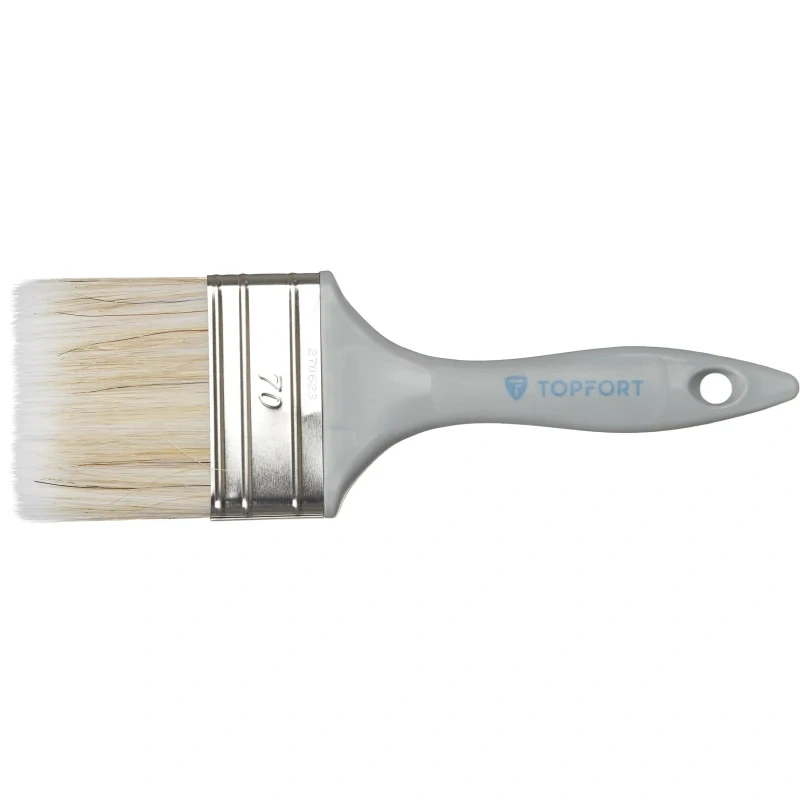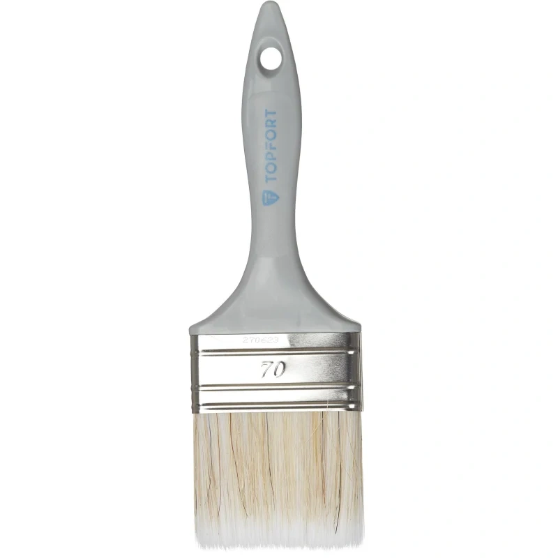 Плоская кисть Topfort подойдет для профессионального и бытового использования, для отделки внутренних и внешних поверхностей, для торцевания или лакировки, окрашивания поверхностей различного размера. Ее можно использовать для работ с акриловыми красками. Комбинированная щетина кисти состоит на 30% из высококачественных натуральных волокон и на 70% из специально произведенных синтетических волокон (ТОПС 70%). Ворс имеет утонченные белые кончики, которые обеспечивают идеально тонкий слой при нанесении. Натуральные волокна кисти служат для сбора и удержания краски, а также для прочности кисти. Ширина изделия составляет 70 мм, толщина ворса: 15 мм. Длина кисти составляет 227 мм. Обойма кисти изготовлена из металла, рукоять — из пластика.