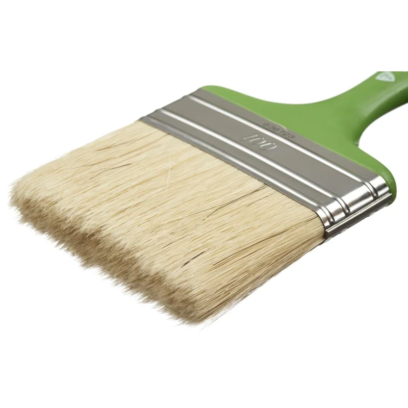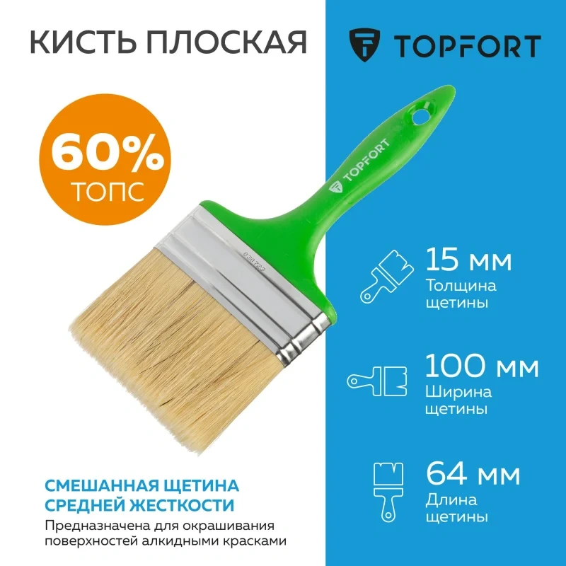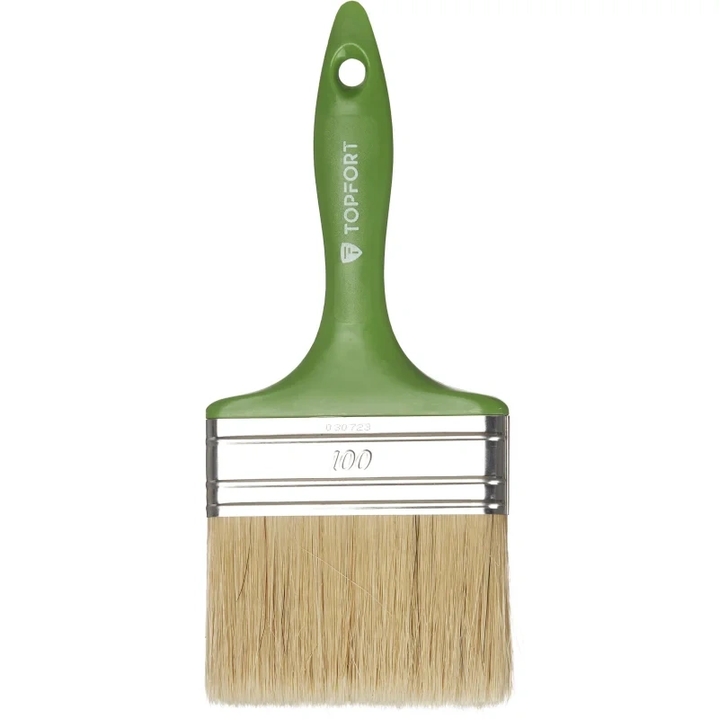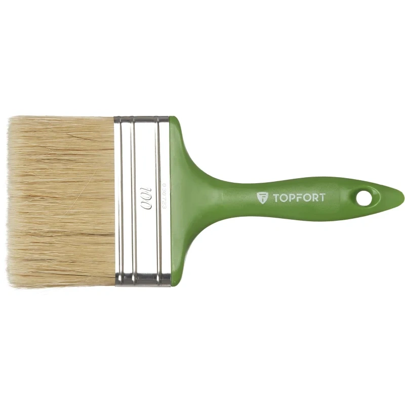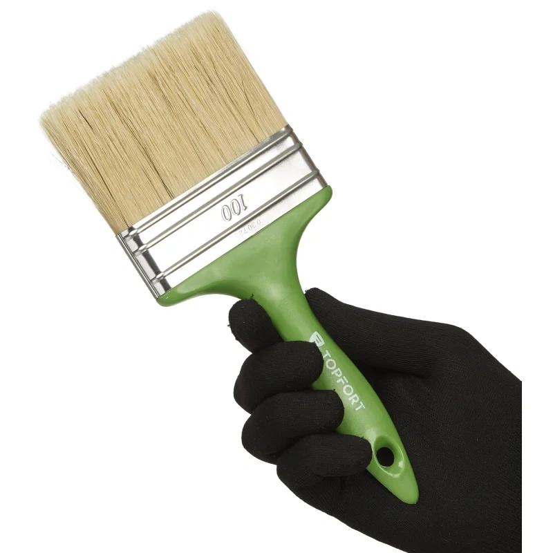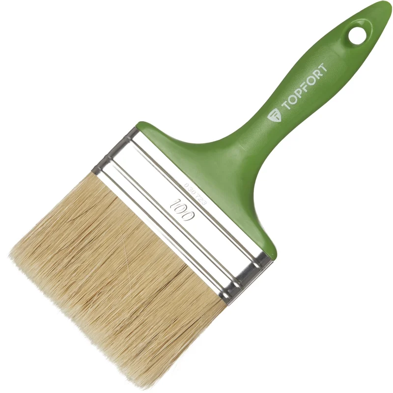 Кисть плоская Topfort предназначена для внешних и внутренних работ. Ее можно использовать для окрашивания поверхностей алкидными красками. Смешанная щетина смешанная средней жесткости надежно закреплена в металлической обойме. Она состоит на 30% из натуральных и на 70% из синтетических волокон с высокой степенью имитации (HIB). Высококачественная щетина (ТОПС 60%) обработана специальным составом, который делает щетину достаточно эластичной. Это обспечивает легкое нанесение краски на поверхность тонким слоем. Ширина изделия составляет 100 мм, толщина ворса: 15 мм. Длина кисти: 233 мм. Обойма кисти изготовлена из металла, рукоять — из пластика. Внешний вид и/или характеристики товара могут быть изменены производителем в соответствии с производственным процессом.